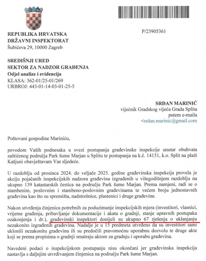 Državna inspekcija nije postupala na nepostojećem problemu, već je u razdoblju od prosinca 2024. do veljače 2025. godine provela nadzor na čak 139 katastarskih čestica u Park šumi Marjan.