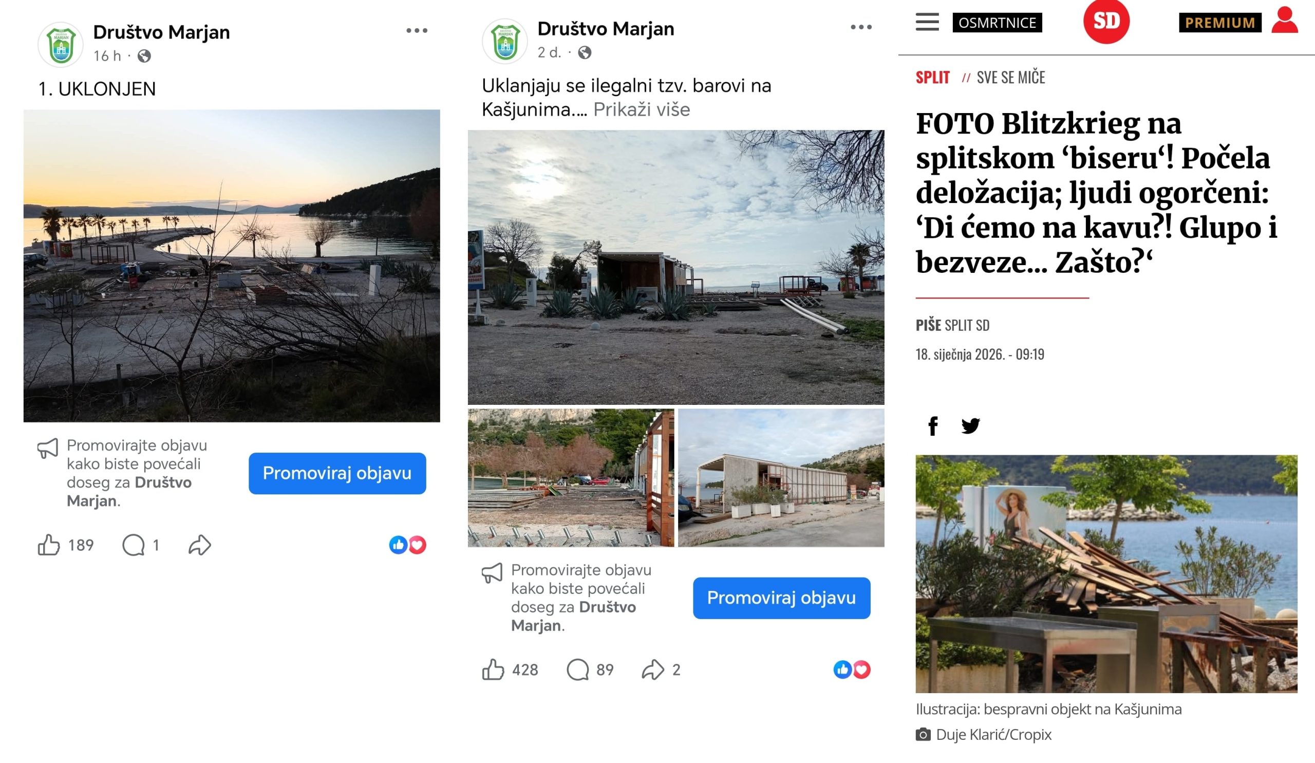 Pojedini mediji svoje naslove temelje na par izoliranih prigovora o “gubitku kave”, svjesno ignorirajući tisuće građana koji godinama traže slobodan i zakonit Marjan. Samo na našim objavama o uklanjanju objekata zabilježeno je preko 650 reakcija podrške. Gdje je u tekstovima tih medija taj “glas naroda”?