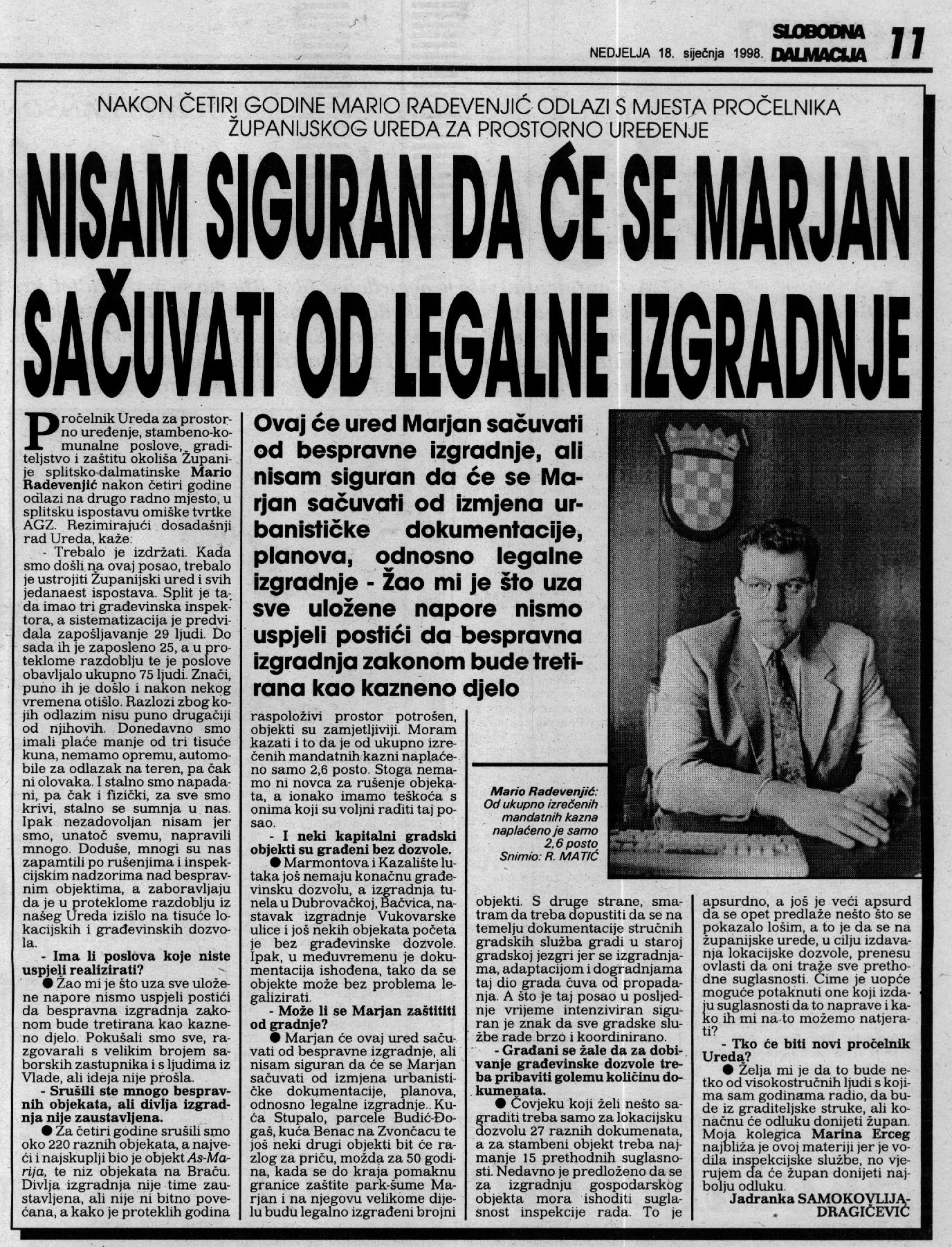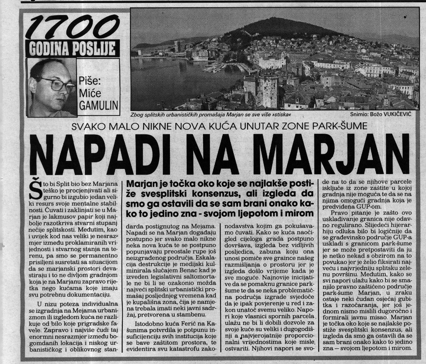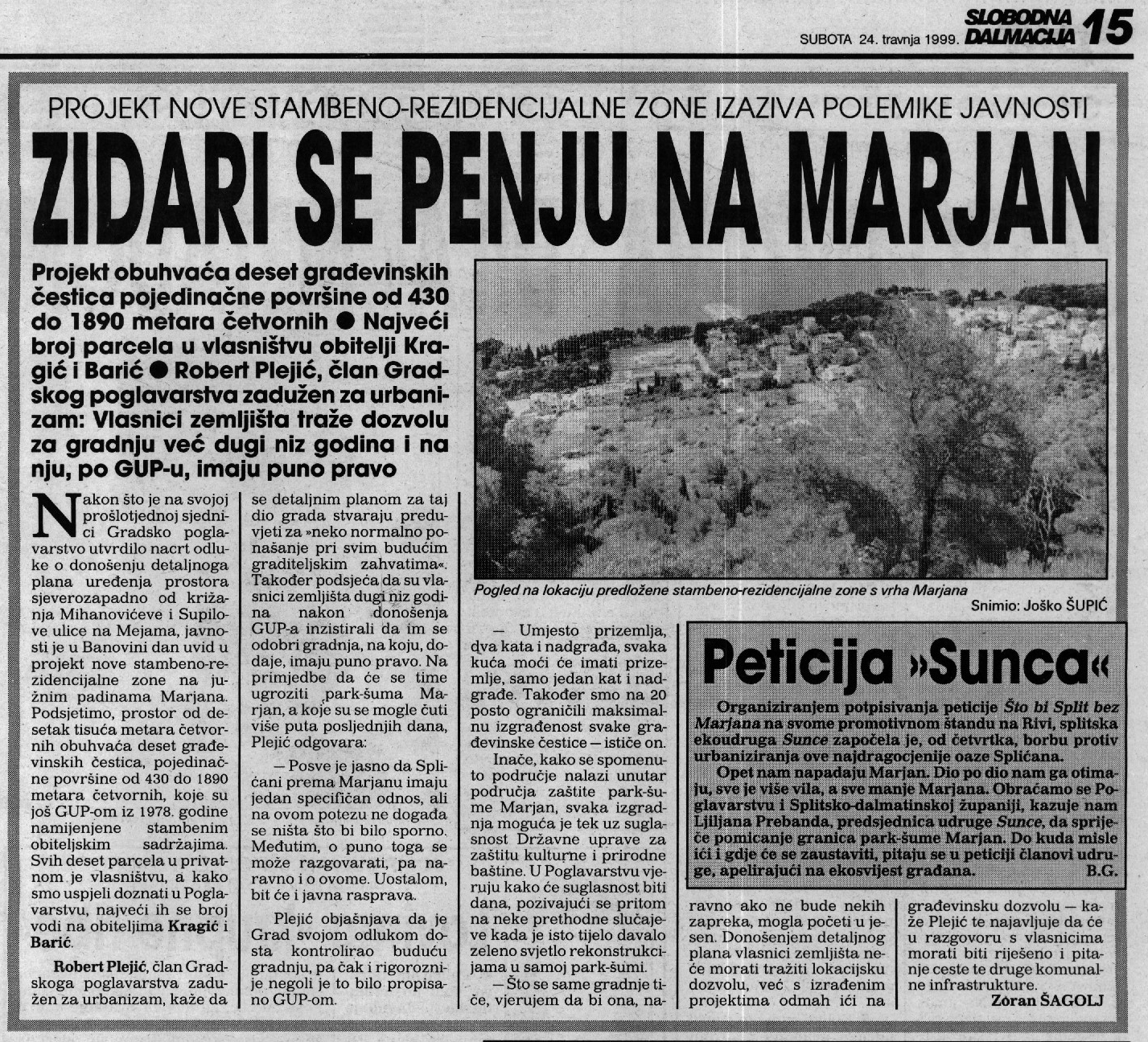 Detaljni plan uređenja (DPU) prostora sjeverozapadno od križanja Ulice A Mihanovića i Supilove ulice predstavlja najveću “legalnu” devastaciju zaštićenog dijela prirode Park-šume Marjan. Predmetnim DPU-om dopušta se gradnja stambenih objekata na 12 katastarskih čestica. DPU je donijelo Gradsko vijeće Grada Splita u travnju 2000., za vrijeme gradonačelnika Ivana Škarića.